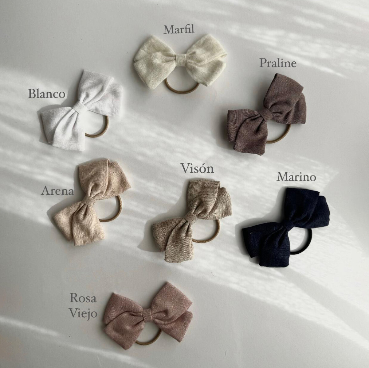 $ 417 Moña de tela con colita elástica. Medida de ancho 9 cm, circunsfetencia colita elástica: 6 cm